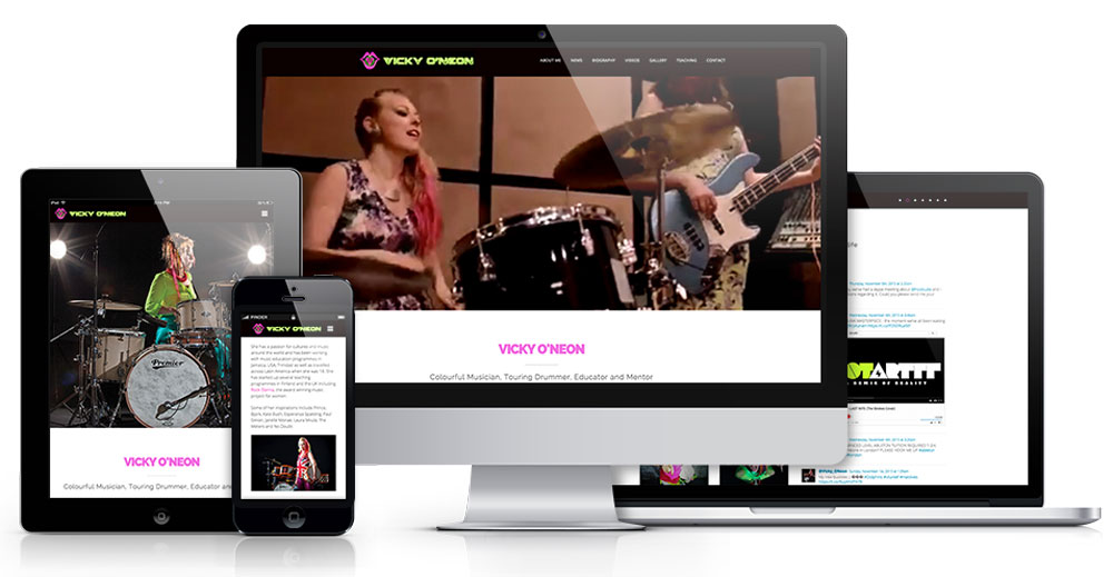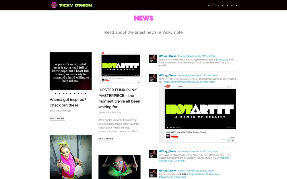 Vicky’s business goals were to build further leads and commercial opportunities within the industry as well as to promote her existing successes, her teaching programmes and mentoring schemes. She wanted to be able to manage all of her social media from a single device (her site) to automatically post to all platforms. Vicky also wanted to have a news publishing platform to document all her activities and events Worldwide. It also had to reflect her unique visual design language and perform on all digital devices seamlessly without having to write code herself.